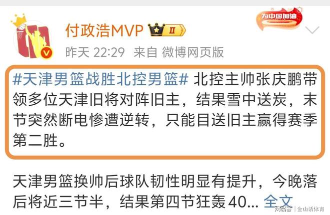 北控輸天津賽后,著名媒體人付政浩在社媒上點評了本場比賽。“北控主帥張慶鵬帶領(lǐng)多位天津舊將對陣舊主,結(jié)果雪中送炭,末節(jié)突然斷電慘遭逆轉(zhuǎn),只能目送舊主贏得賽季第二勝。”;“天津男籃換帥后,球隊韌性明顯有提升,今晚落后將近三節(jié)半,結(jié)果第四節(jié)狂轟40分,生生逆轉(zhuǎn)北控……相比之下,北控末節(jié)明顯有些慌亂無措?!?。