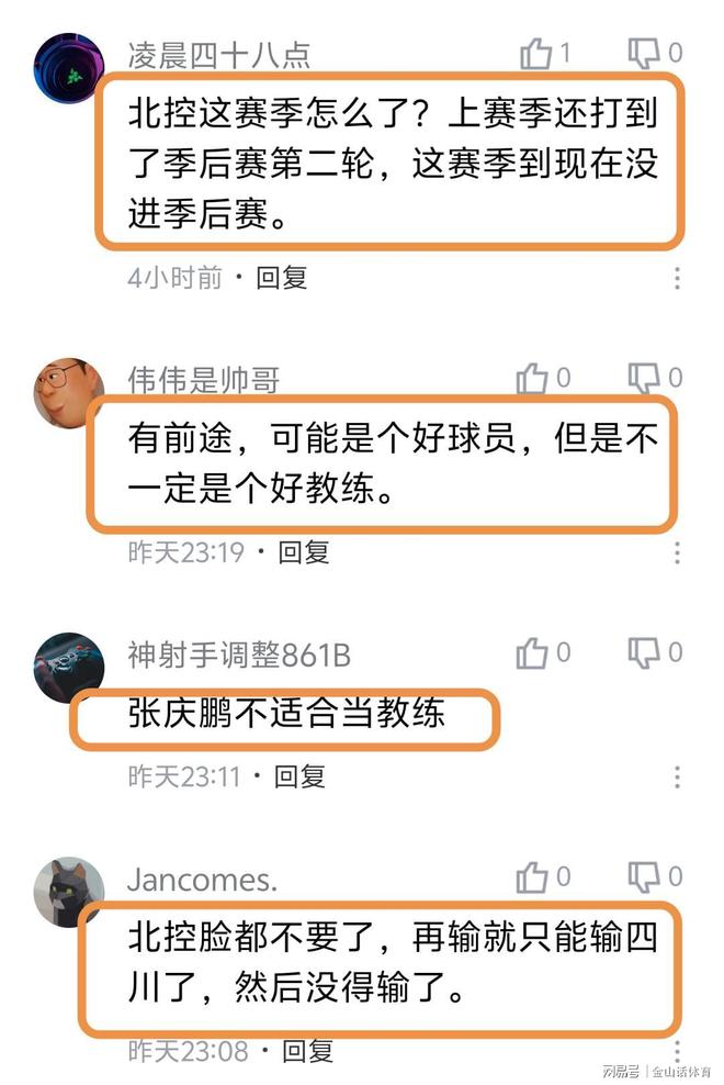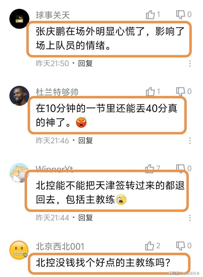 “北控這賽季怎么了?上賽季還打到了季后賽第二輪,這賽季到現(xiàn)在沒進(jìn)季后賽?!?;“有前途,可能是個好球員,但是不一定是個好教練。”;“張慶鵬不適合當(dāng)教練?!保弧氨笨啬樁疾灰?,再輸就只能輸四川了,然后沒得輸了?!?;“張慶鵬在場外明顯心慌了,影響了場上隊員的情緒?!?;“在10分鐘的一節(jié)里還能丟40分真的神了?!?;“北控沒錢找個好點的主教練嗎?”……
