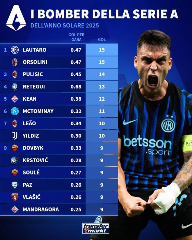 北京時間12月31日,德轉列出了2025年意甲射手榜前10,勞塔羅和奧爾索利尼同以15球并列第一,普利希奇14球第三,麥克托米奈、萊奧、凱南-伊爾迪茲以及尼科-帕斯上榜。