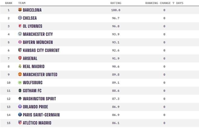 在女足俱樂部排名中,巴塞羅那女足以滿分100分高居榜首?;始荫R德里女足以90.6分位列全球第八,成功躋身由巴薩女足、切爾西女足、里昂女足等隊主導的世界頂級精英行列。