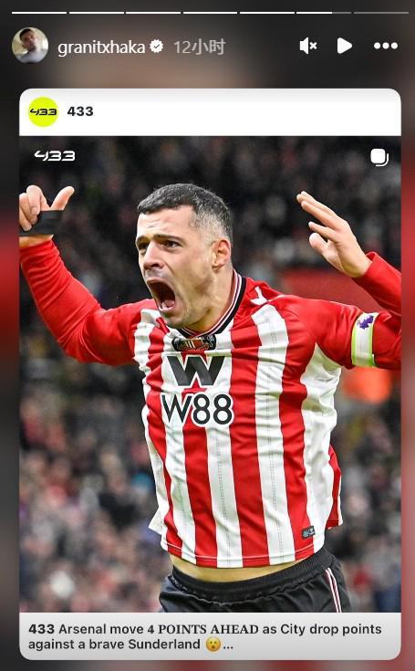 英超第19輪,桑德蘭主場(chǎng)0-0戰(zhàn)平曼城,阿森納在積分榜上的領(lǐng)先優(yōu)勢(shì)達(dá)到4分。賽后,槍手舊將扎卡轉(zhuǎn)發(fā)了阿森納領(lǐng)先曼城4分的海報(bào)。