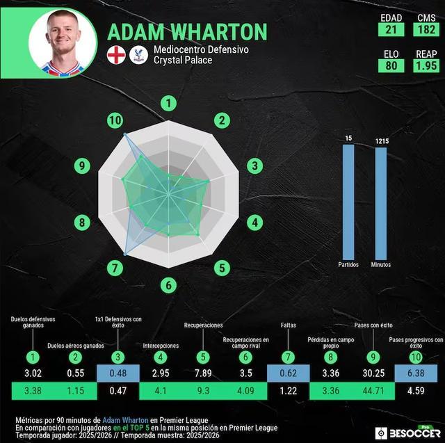 圍繞沃頓的贊譽持續(xù)累積。瓜迪奧拉評價表示,他是一名非常出色的中場球員,對比賽的影響力令人難以置信。里奧-費迪南德將他與卡里克相提并論,The Athletic則因其在高壓情境下的冷靜表現(xiàn),將其與布斯克茨作比較。水晶宮主帥格拉斯納同樣高度依賴沃頓,他在球隊首發(fā)陣容中的出場率達到88%,并被教練組稱贊具備出色的進攻預(yù)判能力,在完成搶斷前就已清楚下一步選擇。沃頓的成長軌跡同樣引人注目。短短半年內(nèi),他從英冠布萊克本流浪者完成跨級轉(zhuǎn)會,以2100萬歐元加盟水晶宮,并隨后被索斯蓋特征召進入2024年歐洲杯英格蘭隊名單。對此,沃頓本人用“超出現(xiàn)實”來形容這段經(jīng)歷。